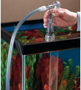 Before perfoming a water change use an algae scraper to clean the inside walls of the tank. Then clean your fish tank with a gravel vacuum. The vacuum cleans the tank by sucking dirt and old food out of the gravel. The gravel vacuum also removes some water from the tank. Stop the vacuum when 1/4 of the water has been removed.